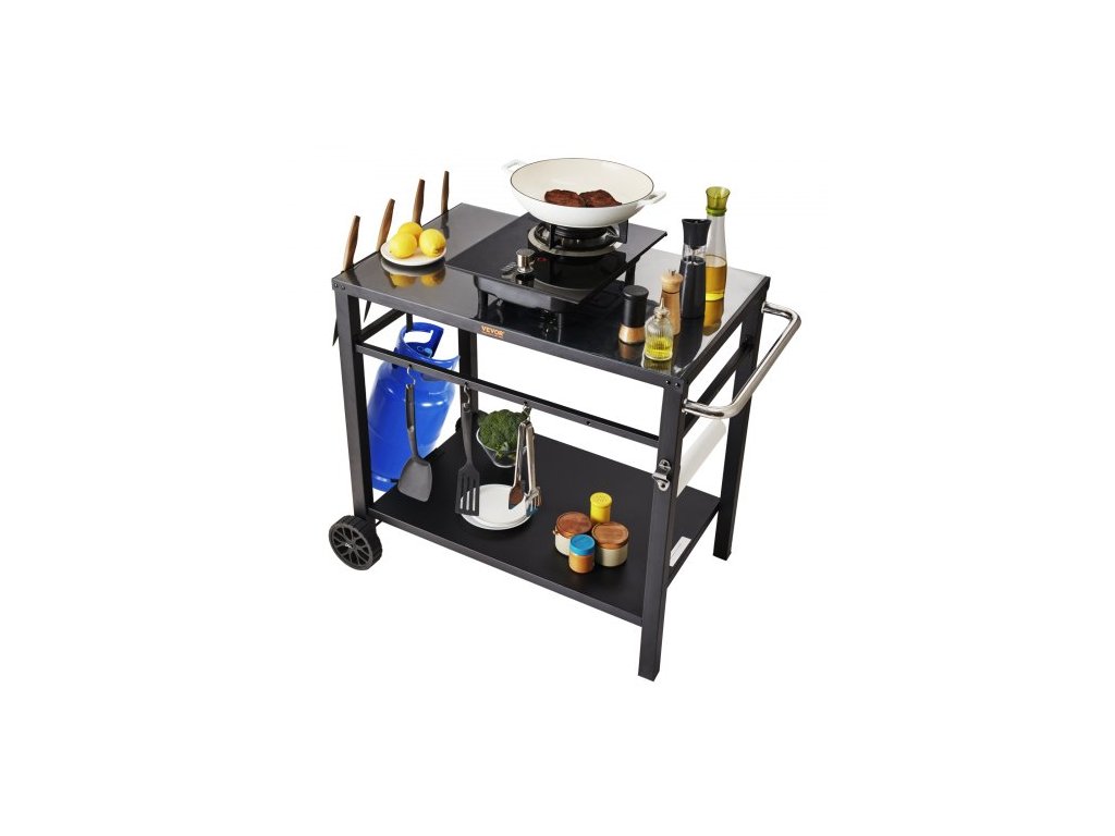 Venkovní grilovací jídelní vozík VEVOR s dvojitou policí, přenosný stůl na přípravu jídla BBQ, multifunkční železná deska stolu, přenosné modulární vozíky do pece na pizzu, pracovní stůl se 2 kolečky, rukojeť pro přenášení, černáVšestranné scénáře použití