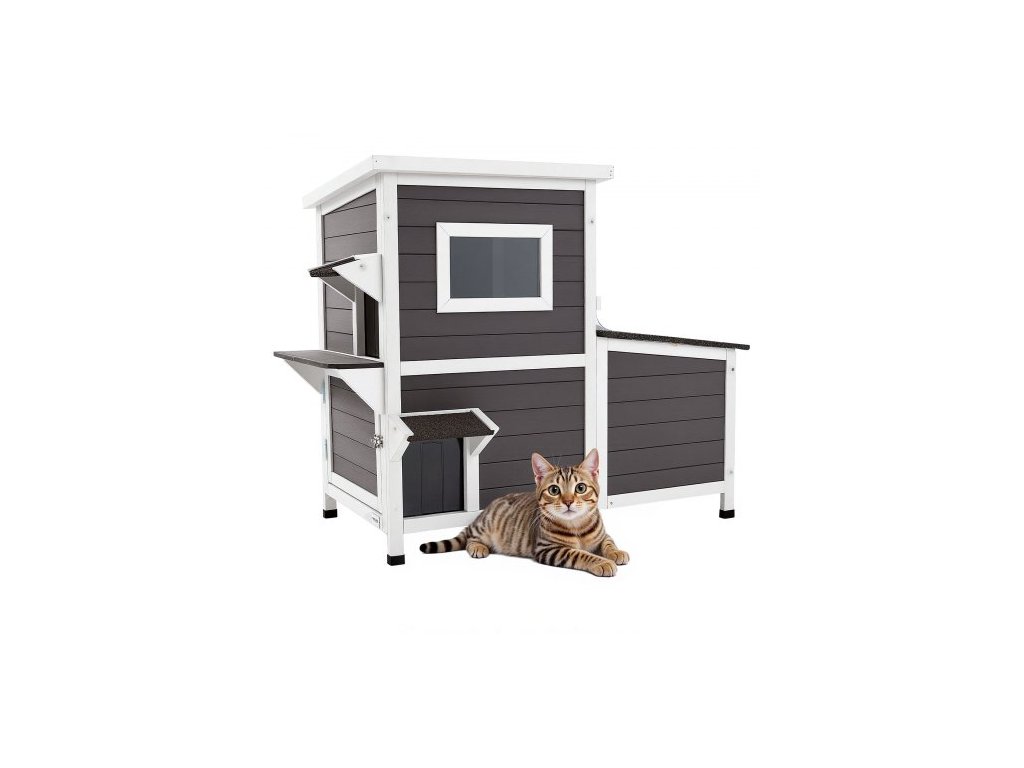 Venkovní kočičí domek VEVOR, dvoupatrový dřevěný kočičí přístřešek pro 3 venkovní kočky v zimě, vyvýšený přístřešek pro divoké kočky se schody, průhledným oknem a výklopnými dveřmi, vodotěsné kočičí byty do zahrady 107 x 63 x 86 cmÚtulný domov pro kočky