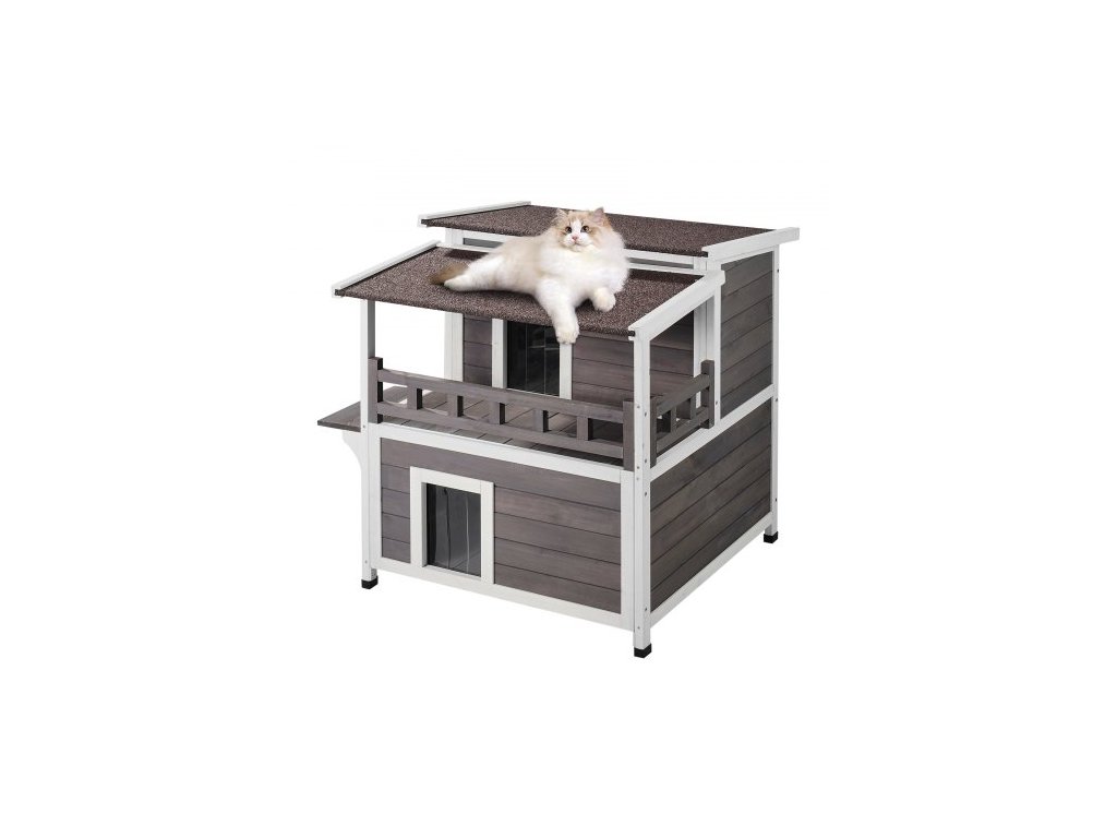 Venkovní kočičí domek VEVOR odolný proti povětrnostním vlivům, přístřešek pro divoké kočky více koček, dvoupatrový velký venkovní dřevěný kočičí domek s balkonem, dveřmi, PVC klapkami a otevřenou střechou, 76 cm D x 76 cm Š x 81 cm V