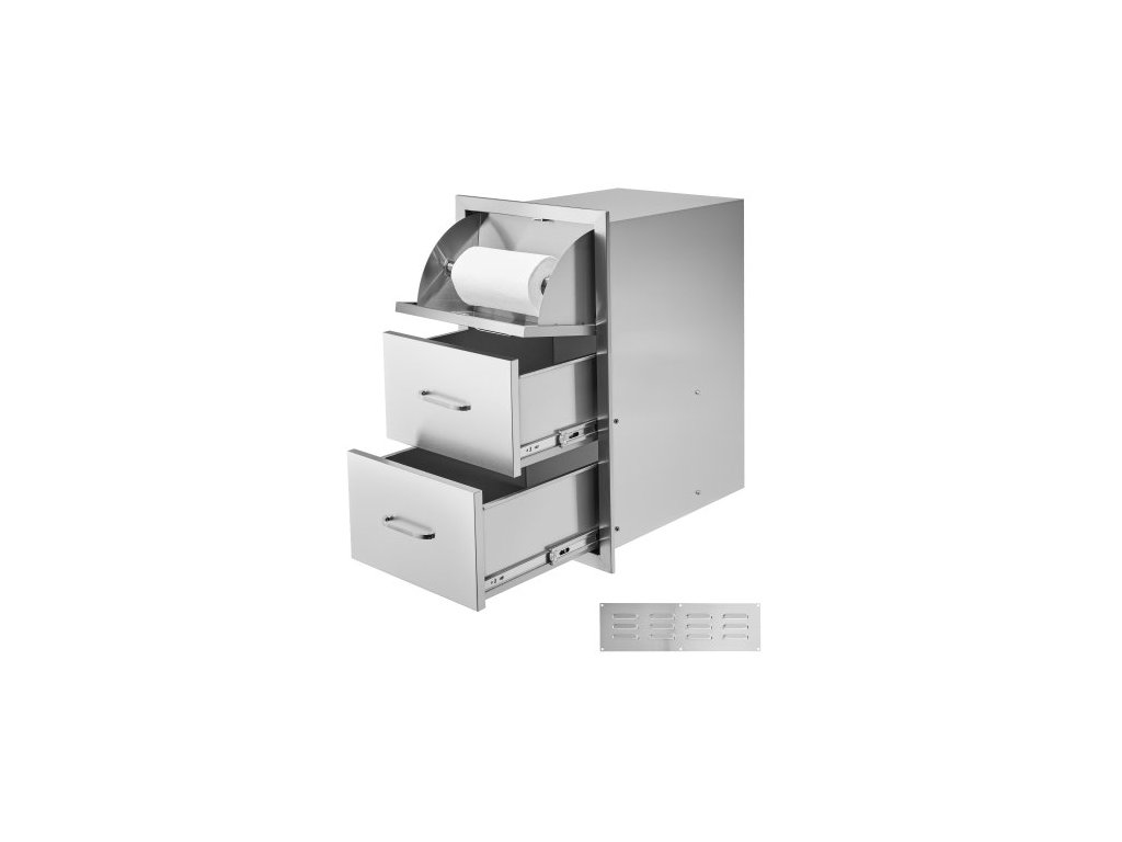 Venkovní kuchyňské zásuvky VEVOR, 16,5"Š x 29"V x 20,5"H, trojité zásuvky, nerezové skříňky s vestavěnou montáží, úložný prostor na grilovací ostrůvek s držákem na papírové ručníky a rukojetí, pro stanici pro grilování na teraseVelký úložný prostor