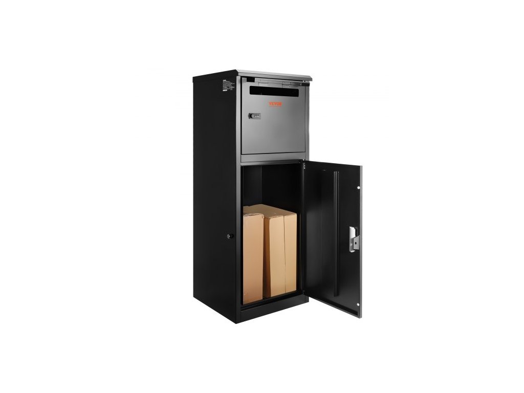 Velikost produktu: 16,2 x 15,8 x 44 palců / 41,2 x 40,1 x 110,5 cm, Barva: Černá, Velikost doručovacího slotu: 10,8 x 1,5 x 40,5 palce / 27,5 x 3,8 x 103 cm, Nosnost: 110 lbs / 50 kg, Materiál: 0,8 mm pozinkovaná ocel, Maximální velikost balení: 12,6 x 14,1 x 24 palců / 32 x 36 x 61 cm, Typ zámku: Kódovaný zámek a stiskněte zámek