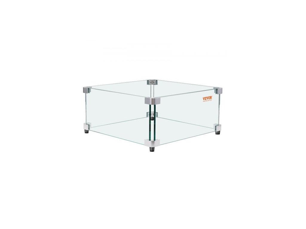 Větrná clona VEVOR pro plynové ohniště pro čtvercový krbový stůl, čirá tvrzená větrná clona pro ohniště 493 x 493 x 191 mm, 8mm silný čtvercový skleněný štít, skleněný panel s tvrdým rohovým držákem a nožičkamiVětruodolné, stabilní a bezpečné