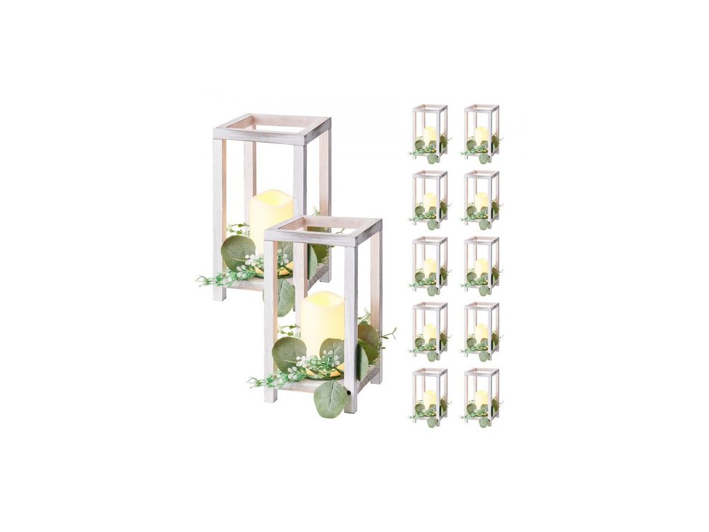 VEVOR 12 sada/36 ks dřevěná svatební lucerna, obsahuje 12 dřevěných svícnů, 12 bezplamenných LED svíček, 12 věnců z eukalyptových listů pro svatební stůl, párty, farmářskou dekoraci, bílá
