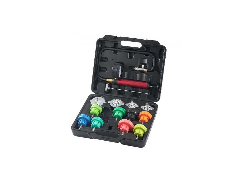 VEVOR 14dílná univerzální sada na měření tlaku chladiče, sada na měření tlaku chladicí kapaliny s ručním čerpadlem a barevně kódovanými ocelovými adaptéry s testovacími uzávěry, s bednou na nářadí, pro automobily, motocykly, nákladní automobily, chladicí systémVysoká kompatibilita