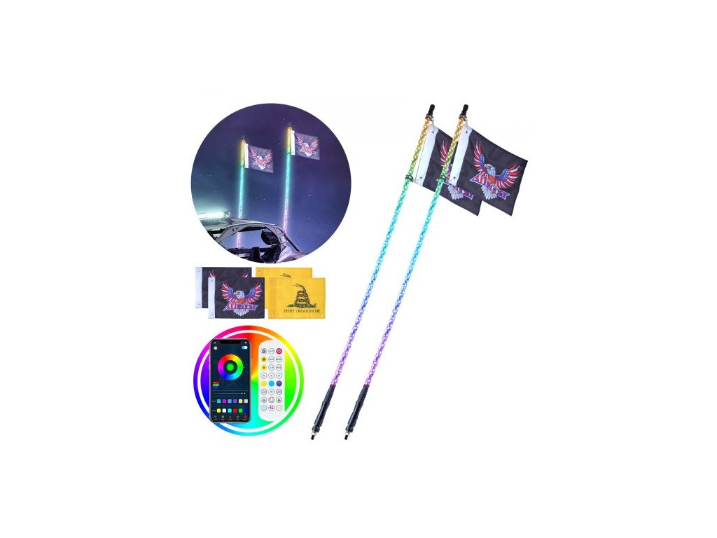 VEVOR 2 KS 5 FT LED světlo na bič, APP a RF dálkové ovládání, vodotěsné 360° spirálové RGB honicí osvětlené biče se 4 vlajkami, pro UTV, čtyřkolky, motocykly, RZR, Can-am, nákladní vozy, terénní vozidla, motokárySnadné ovládání