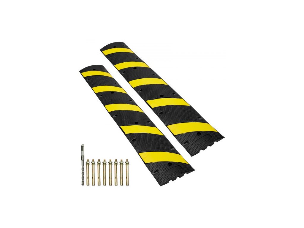 VEVOR 2dílné gumové zpomalovací prahy 183 x 30 x 4,5 cm, 2 kanály, nosnost 100 000 kg, pro těžké dopravní zpomalovací prahy, s vysoce reflexním žlutým proužkem, 8 rozpínacími šrouby a 1 vrtákem, pro asfaltové a štěrkové vozovkyZpomalovací prahy pro štěrkové cesty mají dvoukanálovou konstrukci s rozměry kanálu 3 x 2 cm / 3,18 x 0,79 palce. Výška produktu 1,77 palce usnadňuje vozidlům zpomalení.