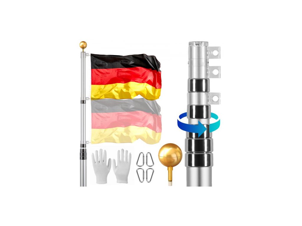 VEVOR 30FT teleskopická sada vlajkového stožáru, odolný stožár z hliníkové slitiny do země pro venkovní použití, 3 režimy zobrazení s profesionálním příslušenstvím, německá vlajka, stříbrnáHliníkový stožár z hliníkové slitiny