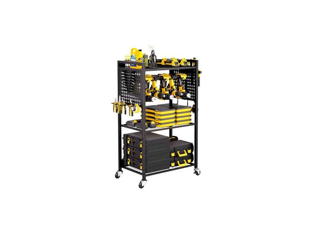 VEVOR 4patrový organizér na nářadí, nosnost 70 kg, podlahový stojan, pojízdný držák na vrtačku a stabilizační úložný stojan, odolný pojízdný úložný vozík do garáže pro dílnu, garáž, černý