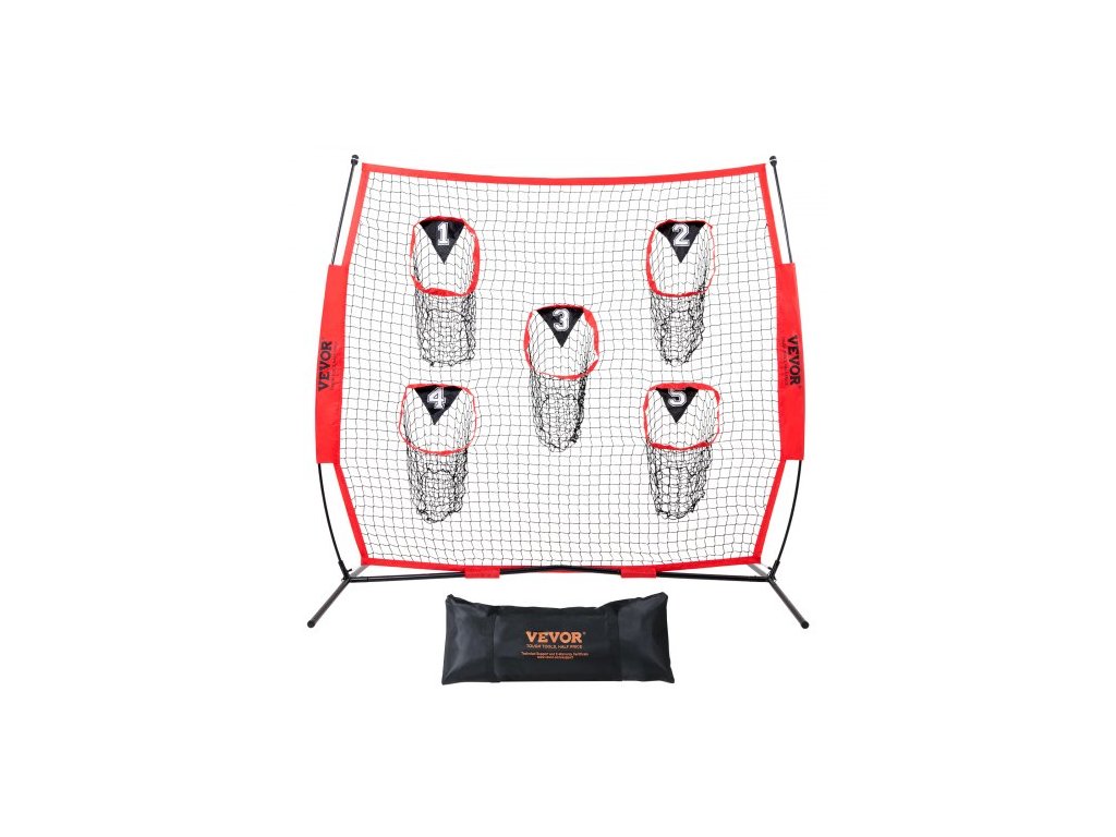 VEVOR 6 x 6 stop trenérská házecí síť na fotbal, tréninková házecí síť na terč s 5 kapsami na terč, bezuzlová síť obsahuje rám luku a přenosné pouzdro, zlepšuje přesnost hodu quarterbackem, červenáZvýšení přesnosti