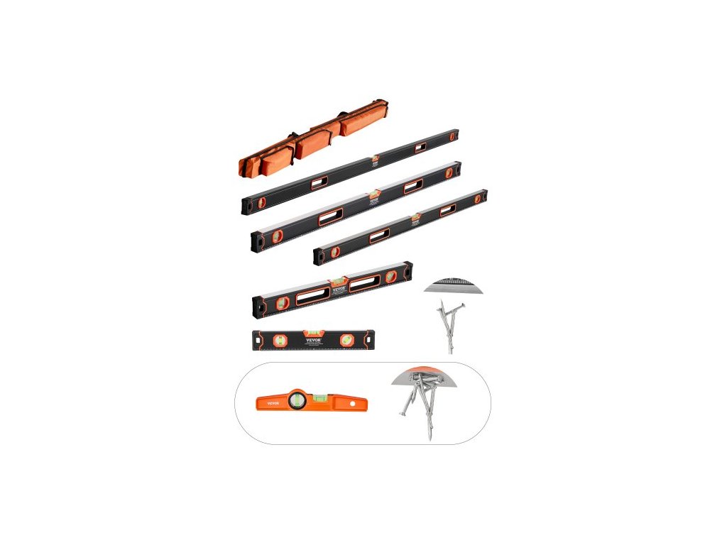 VEVOR 6dílná torpédová vodováha, sada krabičkových vodováh 78/48/32/24/16/10 palců, pravítko s bublinovými libelami pro 45/90/180 stupňů, nárazuvzdorný magnetický nivelační nástroj z hliníkové slitiny, stupnice SAE/metrická (magnet má pouze 10 palců)Rukojeť z ABS a TPE