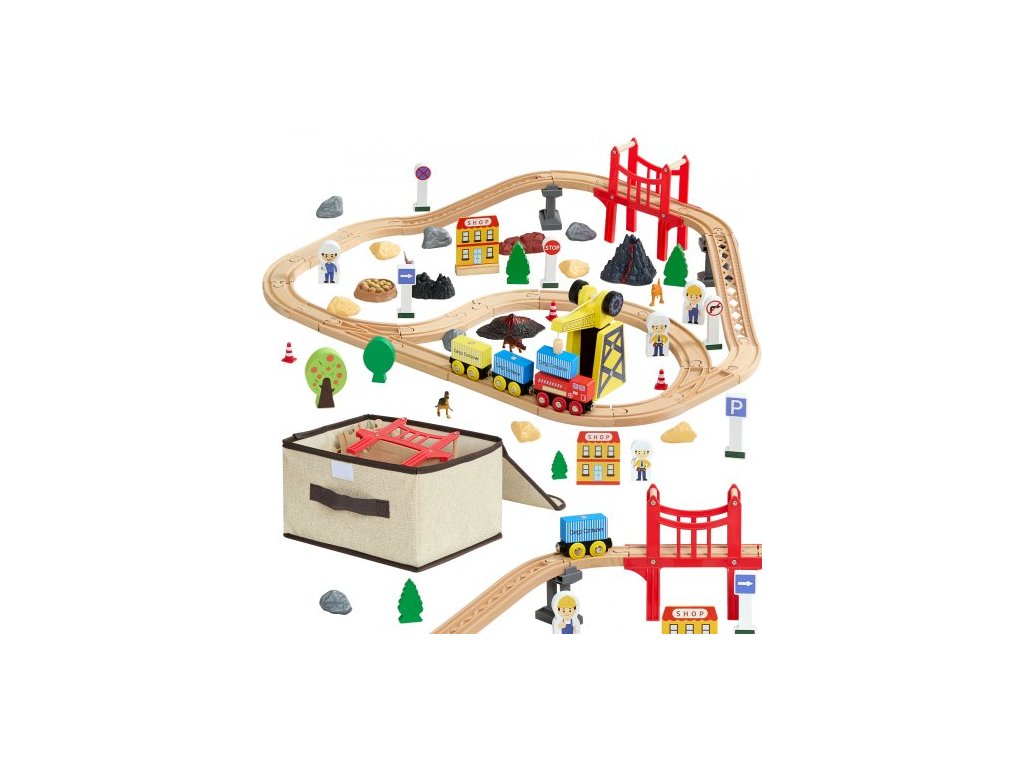 VEVOR 70dílná dřevěná vláčkodráha s magnetickým jeřábem, dřevěná vláčkodráha pro děti ve věku 3-8 let, stavební jeřáb, železniční sada, kompatibilní s hlavními značkami, vánoční narozeninová hračka pro batolata a chlapceZvýšený most