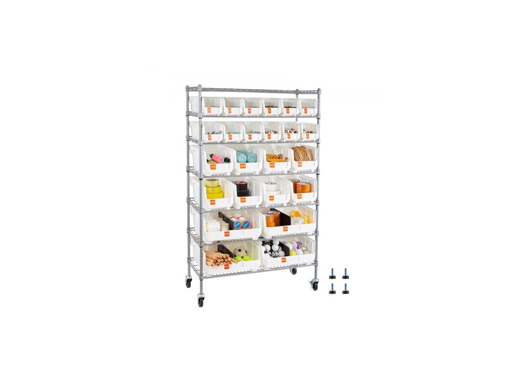VEVOR 7patrový regál na pojízdné kontejnery, 24 organizérů, ocelový drátěný regálový systém s kolečky, mobilní organizér na nářadí do garáže, skladu, kanceláře, restaurace, učebny, kuchyněModulární a mobilní napájení