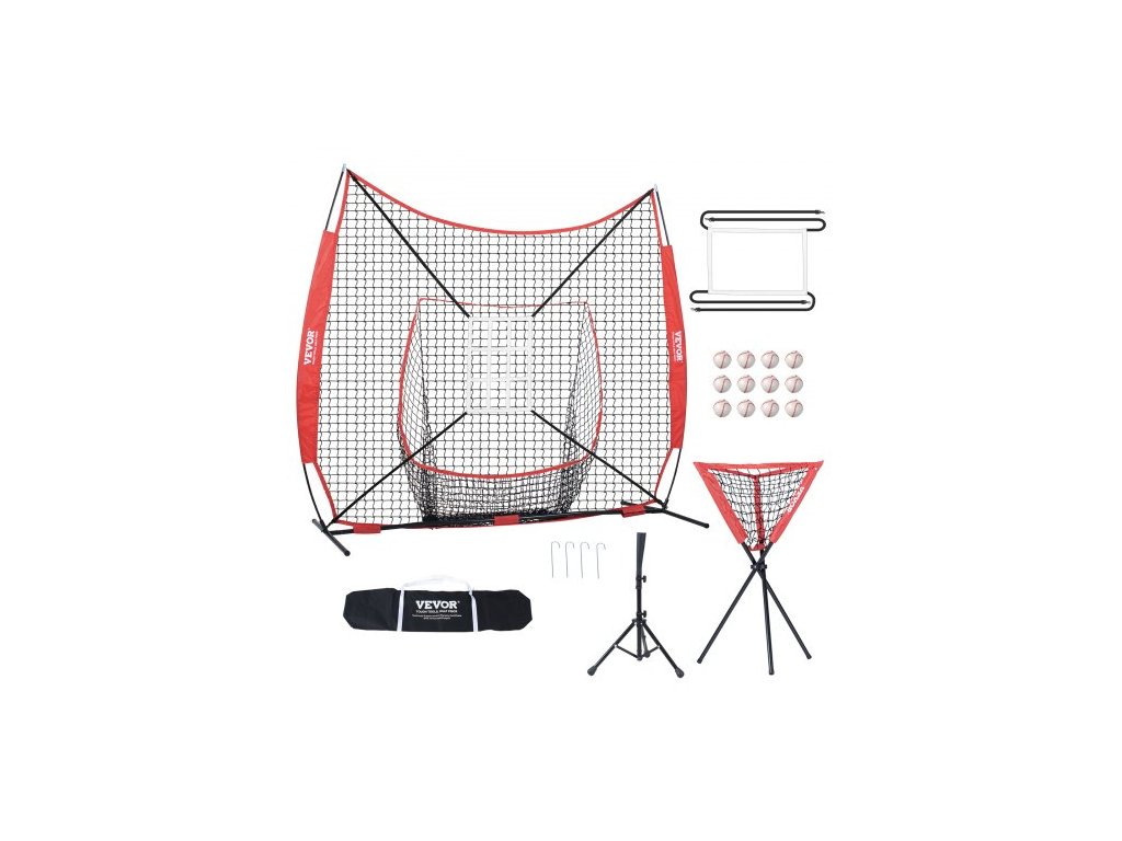 VEVOR 7x7 stop baseballová tréninková síť na softball, přenosná baseballová tréninková síť pro odpalování, chytání a nadhazování, vybavení pro zastavení s rámem pro luk, přepravní taška, úderová zóna, 12 míčků, odpaliště a sběrač míčkůCílový rám