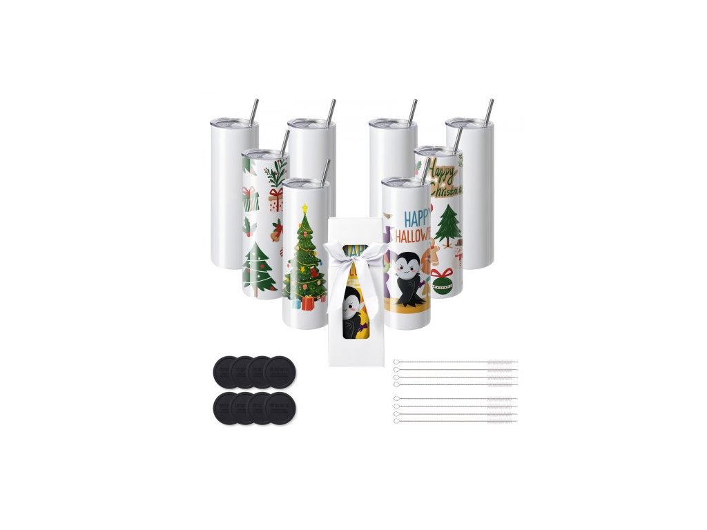 VEVOR 8 balení rovných sublimačních pohárků, 30 oz prázdné pohárky, nerezové pohárky s dvojitou stěnou s brčkem, víkem, štětcem, základnou, smršťovací fólií, dárkovou krabičkou, pro lisování teplem a přenos teplaOdolný Materiál