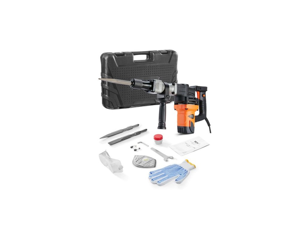 VEVOR Demoliční zvedák Kladivo Lamač betonu 1600W elektrické kladivo 2 sekáčToto elektrické sekací kladivo je lehké a má robustní 1400W motor. Poskytuje silnou energii nárazu pro dokončení demoličních, sekacích, výkopových, drážkovacích a řezacích projektů.
