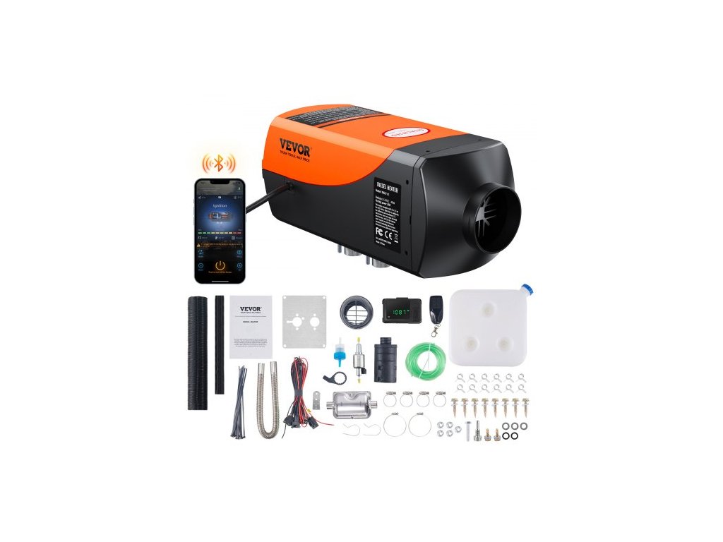 VEVOR Dieselový ohřívač vzduchu s ovládáním přes Bluetooth, 12V 2KW Dieselový ohřívač s automatickým nastavením nadmořské výšky, dálkovým ovládáním a LCD, Dieselový nezávislý ohřívač pro RV, přívěs, obytný vůz, loď