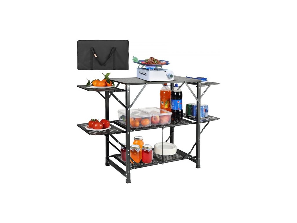 VEVOR kempingový kuchyňský stůl, jednodílná skládací přenosná kuchyňská stanice s přepravní taškou, hliníkový kempingový stůl, 4 železné boční stolky a 2 police, ideální pro venkovní pikniky, grilování, kempování, cestování v karavanuVíce volného prostoru
