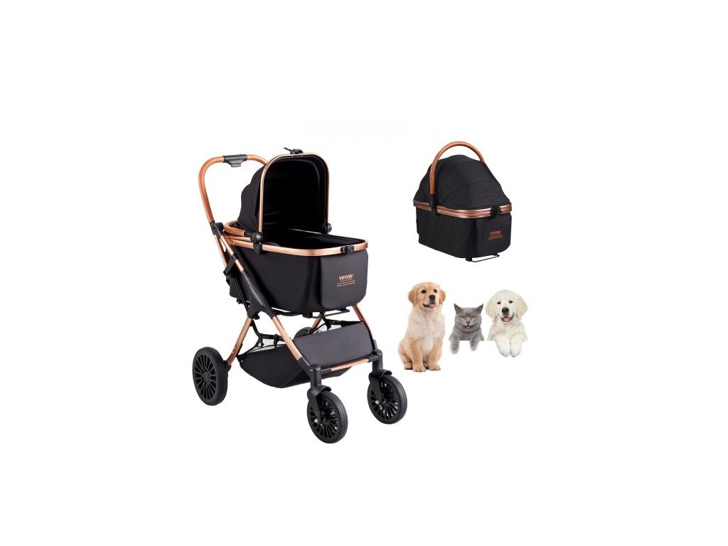 VEVOR kočárek pro psy, 4kolový kočárek pro psy otočný s brzdami, nosnost 29,9 kg, kočárek pro štěňata s odnímatelným nosičem, úložným košem a podložkou, pro malé až střední psy, černáRám z hliníkové slitiny