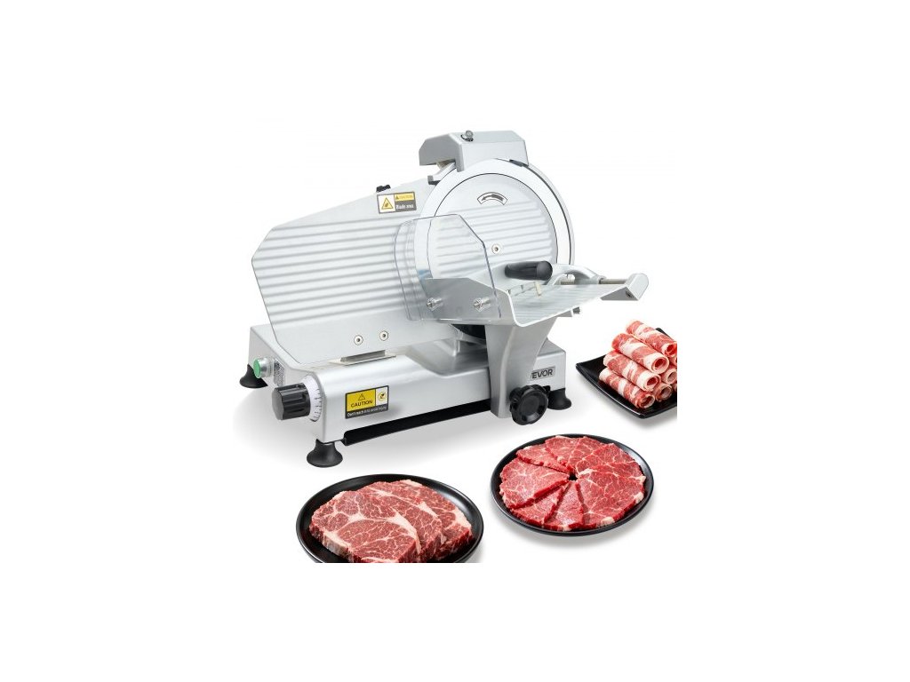 VEVOR Komerční kráječ masa, elektrický kráječ na lahůdky 320 W s ostrou čepelí 250 mm, kráječ masa s rychlostí krájení 450 ot./min, nastavitelná tloušťka 0-10 mm, pro mražené maso, šunku, bagety a steaky