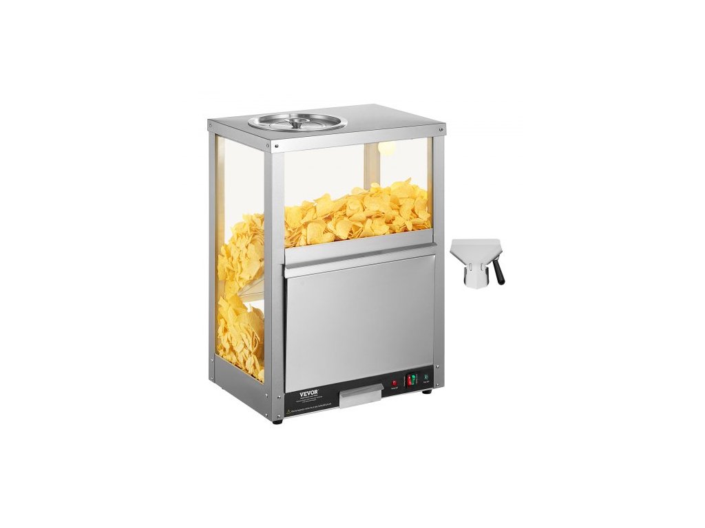 VEVOR Komerční ohřívač nachos chipsů, 80l ohřívač chipsů s topnou základnou a ohřívacím světlem, stroj na nachos s deflektorem, nerezová ocel, na nachos chipsy, popcorn, bramborové lupínky, arašídyUdržujte teplé a křupavé