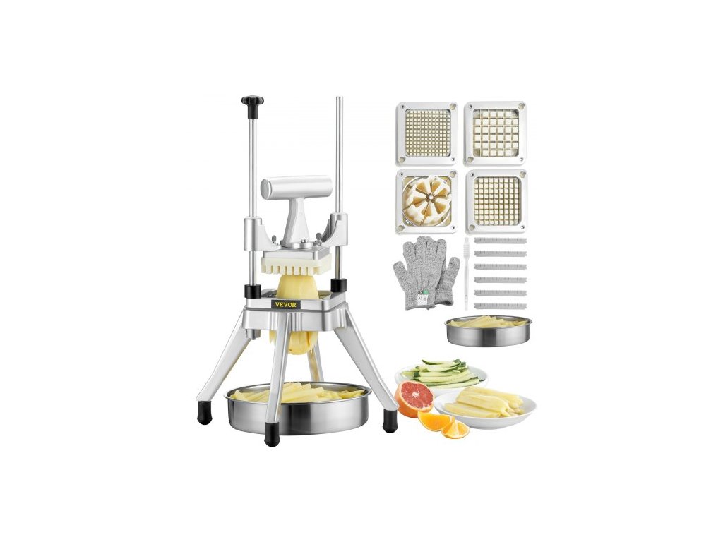 VEVOR Komerční sekáček na zeleninu a ovoce, nerezový kráječ na hranolky se 4 noži 1/4" 3/8" 1/2", 6klínový kráječ, sekáček na kostky s tácem, odolný kráječ na brambory, rajčata, cibuli a houbyRobustní konstrukce