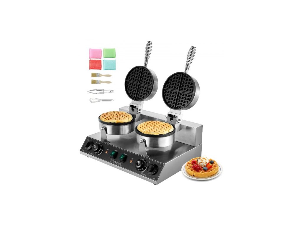 VEVOR Komerční výrobník vaflí, kulatý stroj na vafle se dvěma hlavami, belgický vaflovač z nerezové oceli s nepřilnavým povrchem, 2460 W, regulace teploty a času, rukojeť, pro restaurace, pekárny, bary a bary