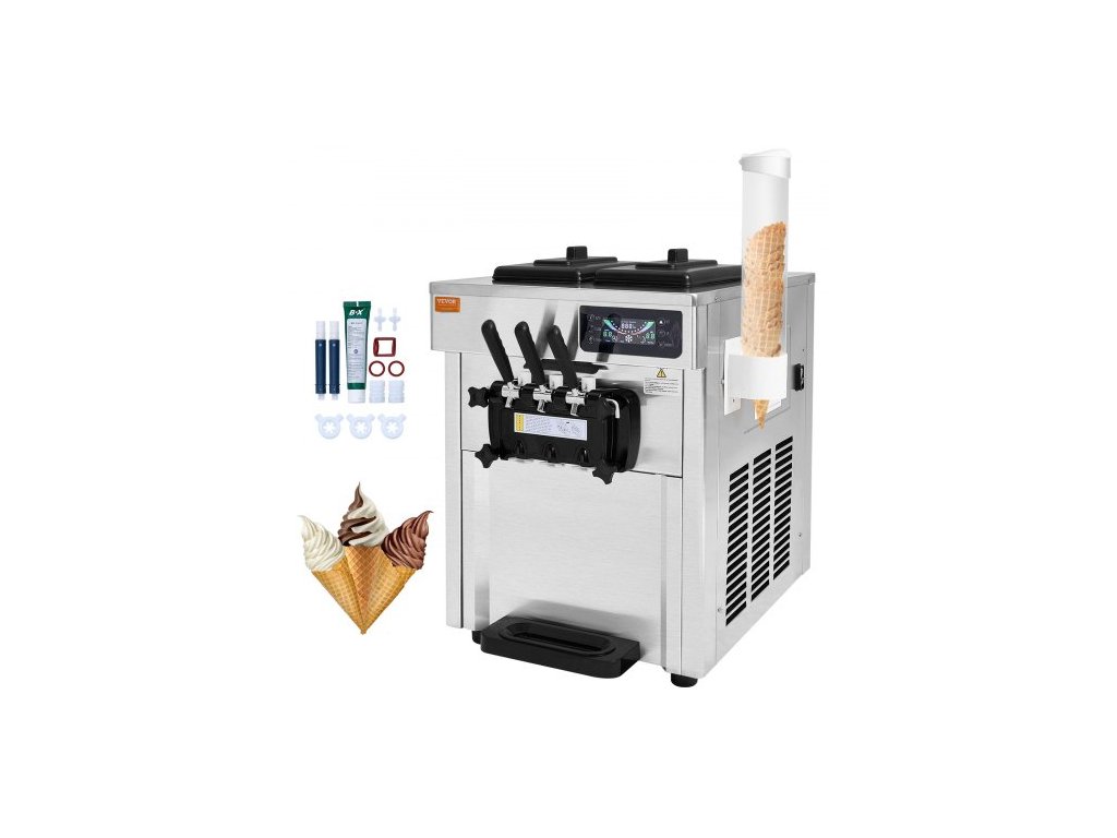 VEVOR Komerční výrobník zmrzliny, výtěžnost 18-28 l/h, stolní výrobník měkké zmrzliny 1650 W se 3 příchutěmi, 2 x 5,5l nerezové válce, LED panel s automatickým čištěním a předchlazením, pro restaurace a baryStolní stroj na zmrzlinu