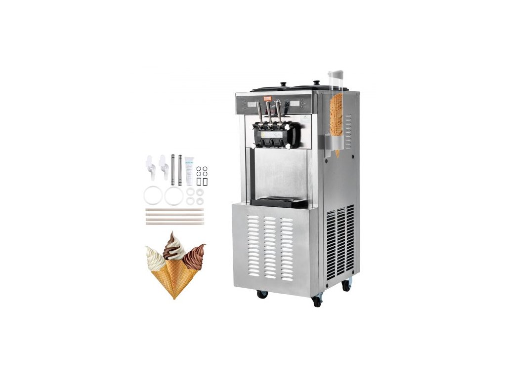 VEVOR Komerční výrobník zmrzliny, výtěžnost 34-44 l/h, 1850W volně stojící výrobník měkké zmrzliny se 3 příchutěmi, 2 x 9l zásobník z nerezové oceli, LED panel umožňuje použití jednoho válce a noční chlazení