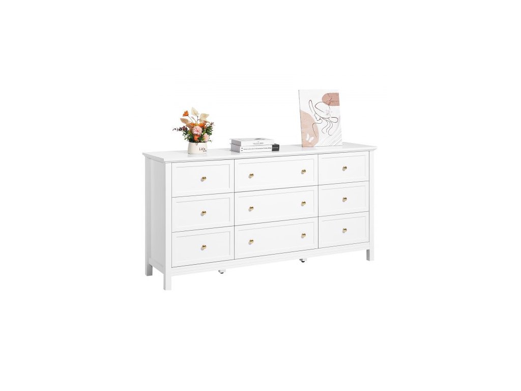 VEVOR Komoda s 9 zásuvkami, dřevěná komoda s posuvným a protipřevrhovacím zařízením, retro minimalistická komoda, úložný prostor na skříň, TV stolek, organizér do obývacího pokoje, chodby, ložnice, vstupní haly, bíláMultifunkční komoda se zásuvkami
