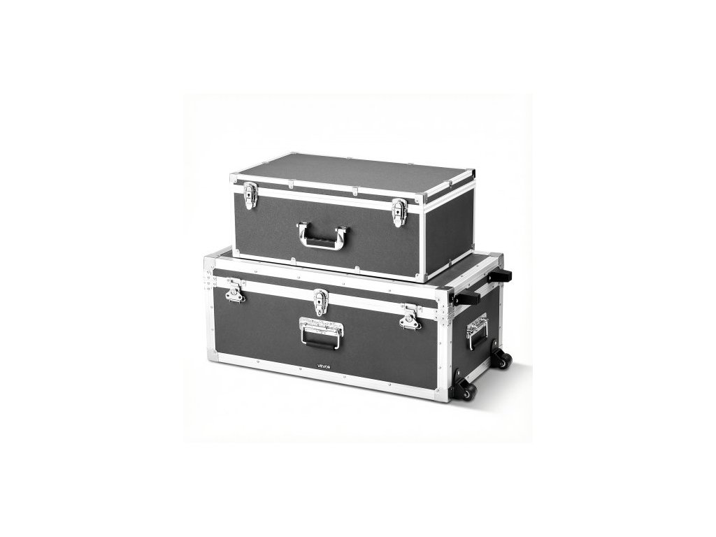 VEVOR Kovový úložný truhlík, sada 2 kusů, dřevěné úložné boxy na kufry s visacími zámky, velký truhlík obsahuje kolečka a 3 kovové rukojeti, dekorativní úložný truhlík s víky na cesty, do bytu, na kolej, šedýVelkokapacitní úložiště