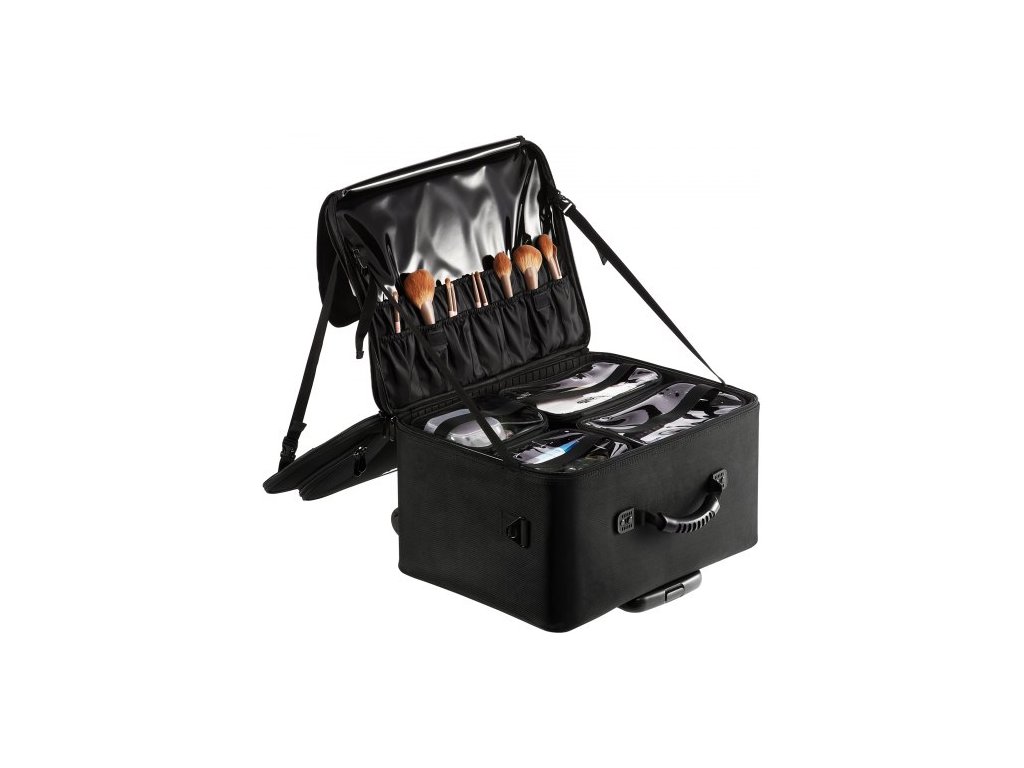 VEVOR Kufřík na make-up s kolečky, velký úložný prostor, 3 úrovně, pohodlné nošení s rukojetí, kolečky, popruhem, profesionální organizér na make-up, vodotěsný, oxfordský, černý