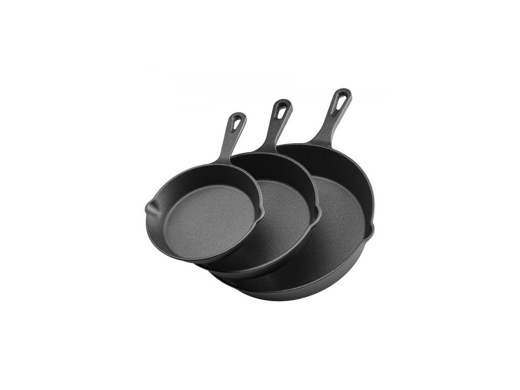 VEVOR Litinová pánev, sada 3 pánví (160, 220, 265 mm), odolné pánve s tepelně odolnou rukojetí, předem ochucená šéfkuchařská pánev, kuchyňské nádobí, pro troubu, plynovou, elektrickou, indukci, černáOdolné materiály