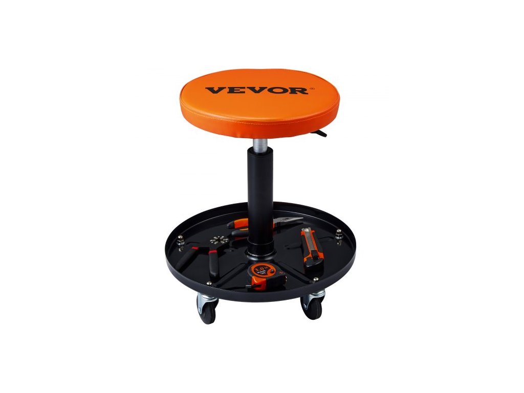 VEVOR mechanická stolička, 250 LBS rolovací pneumatická plazivá sedačka pro garáž/dílnu, nastavitelná výška 22 in-28 v polstrované rolovací pracovní židli s podnosem na nářadí, pro garáž, obchod, autoopravnu, černá+oranžová