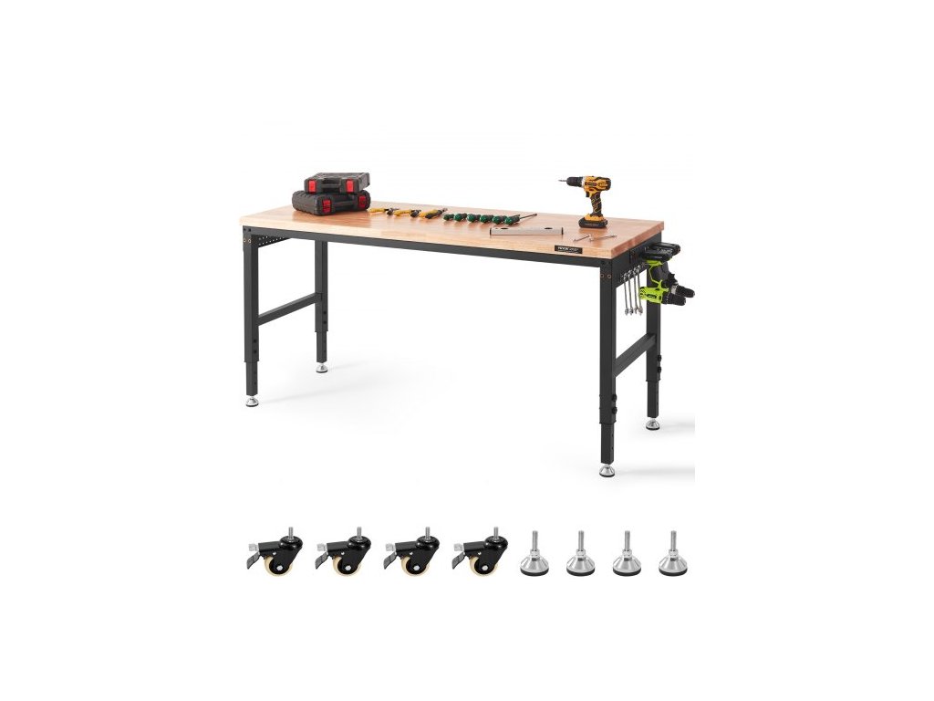 VEVOR Nastavitelná pracovní deska, rozměry: 72" x 25", nastavitelná výška: 28"-40"", maximální nosnost 3000 liber, stůl se zásuvkami, dřevěná deska pro kancelář, domov a garážuniverzální kola
