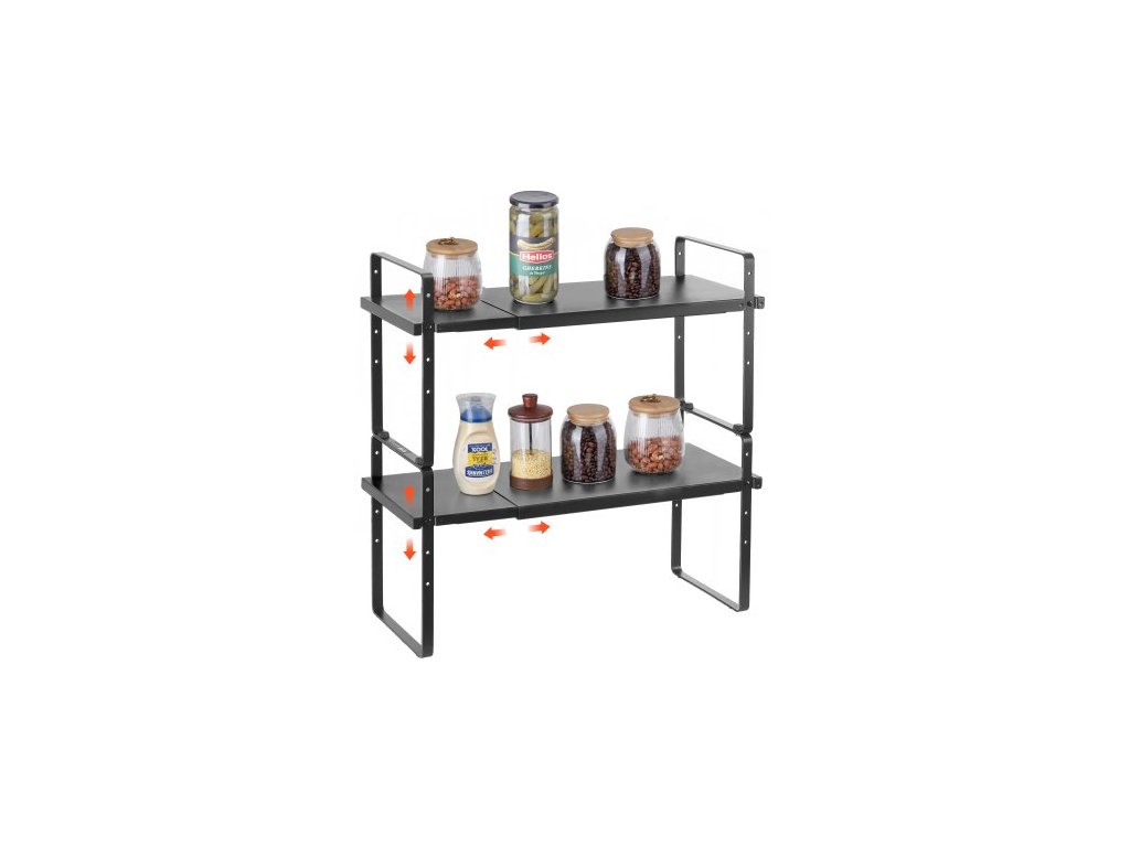 VEVOR Nastavitelný organizér na police do kuchyňské linky, Rozšiřitelná 2úrovňová police do linky, Stohovatelné organizéry na pracovní desku a úložné police, Organizéry do spíže do kuchyně, koupelny a kanceláře, ČernáMultifunkční stojan na koření