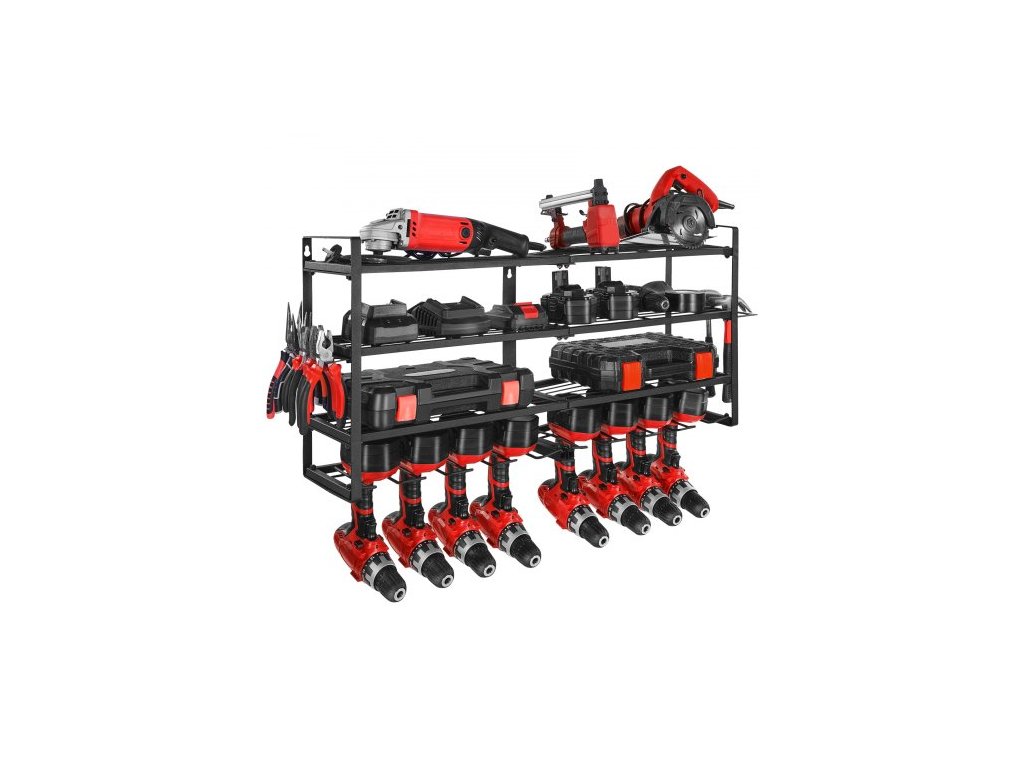 VEVOR Nástěnný organizér na elektrické nářadí, 4vrstvý úložný stojan s 8 držáky vrtáků, držákem na nářadí a úložným stojanem s držákem šroubováků, organizér na nářadí do garáže, na pracovní stůl a do dílny
