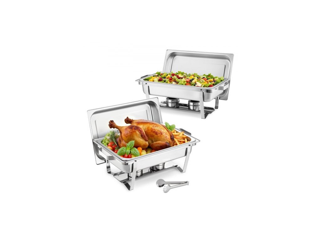 VEVOR Obdélníková ohřívací miska, 8,5l 2 kusy nerezové ohřívací misky, kompletní sada ohřívače jídla s dutou rukojetí, 1 kleště na jídlo, víko, držák paliva, ohřívací misky na bankety, večírky, svatby