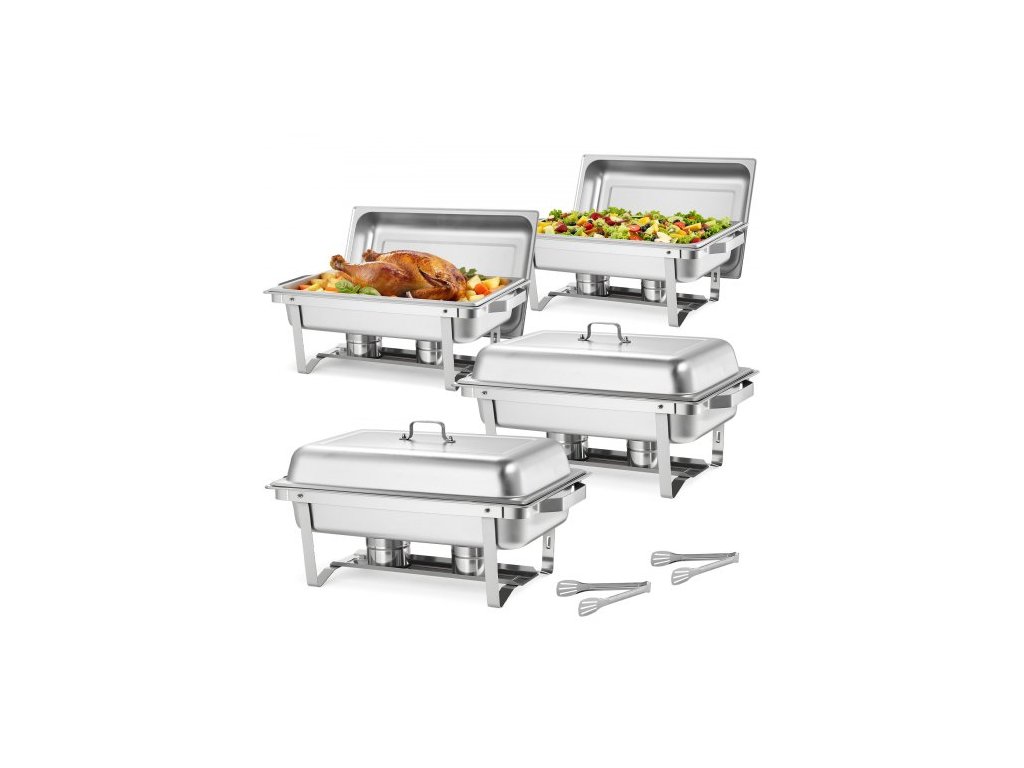 VEVOR Obdélníková ohřívací miska, sada 4 ohřívačů jídla z nerezové oceli o objemu 9 qt, kompletní sada ohřívačů jídla s dutou rukojetí, 2 kleště na jídlo, víko, držák na nádobu, ohřívače jídla pro bankety, večírky, svatby