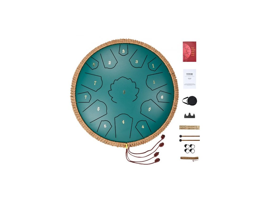 VEVOR ocelový buben s jazýčkem, 14 palců a 15 not, dešťový buben pro venkovní zahradu, tónina D dur, tankový buben se 2 paličkami a přepravní taškou, ruční pan buben, bicí nástroj pro hudební výchovu, jógu, zelený