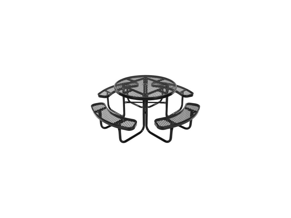 VEVOR Odolný piknikový stůl, venkovní nábytek, odolný proti povětrnostním vlivům, jídelní sada na terasu, potažené ocelové stoly s otvorem pro slunečník, kulatý stůl a lavice 46", do zahrady, na dvůr, na verandu (černý)Jednoduchý a praktický design