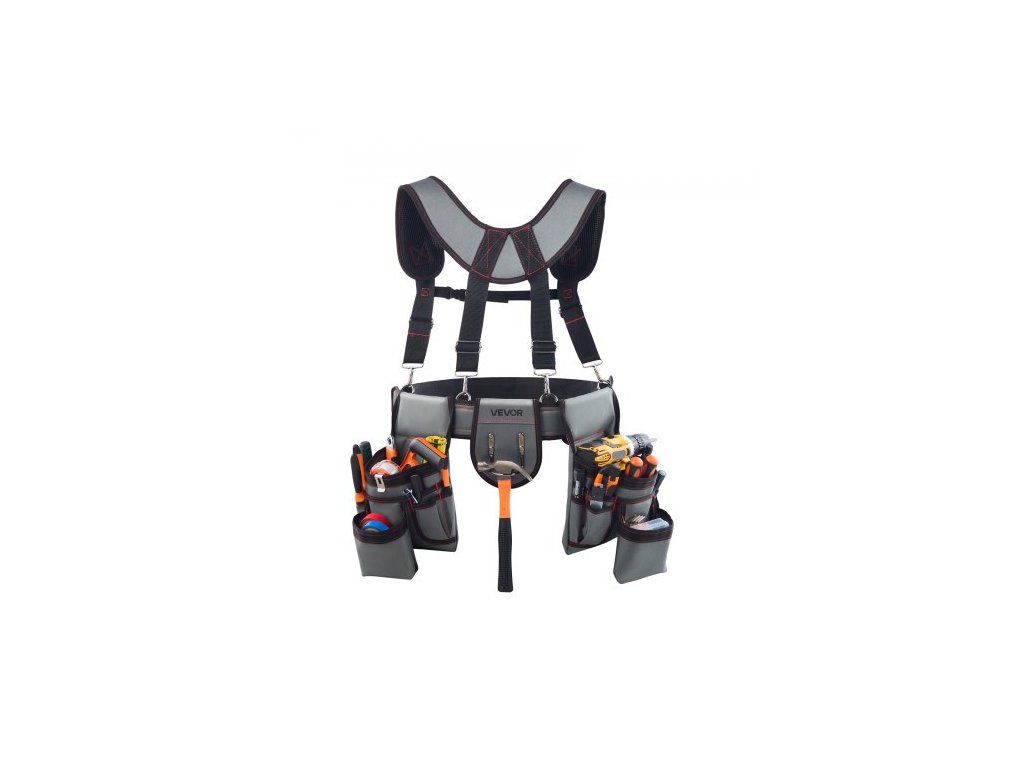 VEVOR Opasek na nářadí, 22 kapes, pouzdro na nářadí s podvazky pro muže, odolný nastavitelný opasek s podvazky pro elektrikáře, tesaře, stavebnictví, organizér na pracovní zástěry, nastavitelný pas 81-173 cmVícekapsový design