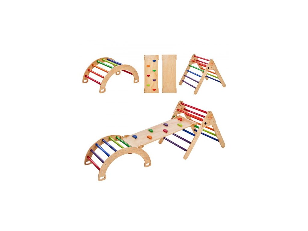 VEVOR Pikler trojúhelníková sada, 5 v 1 lezecké hračky pro batolata, vnitřní hřiště, Montessori lezecká sada s trojúhelníkem, rampou a obloukem, velká dřevěná lezecká hrazda pro batolata 1-3 roky, barevnáVnitřní hřiště 5 v 1
