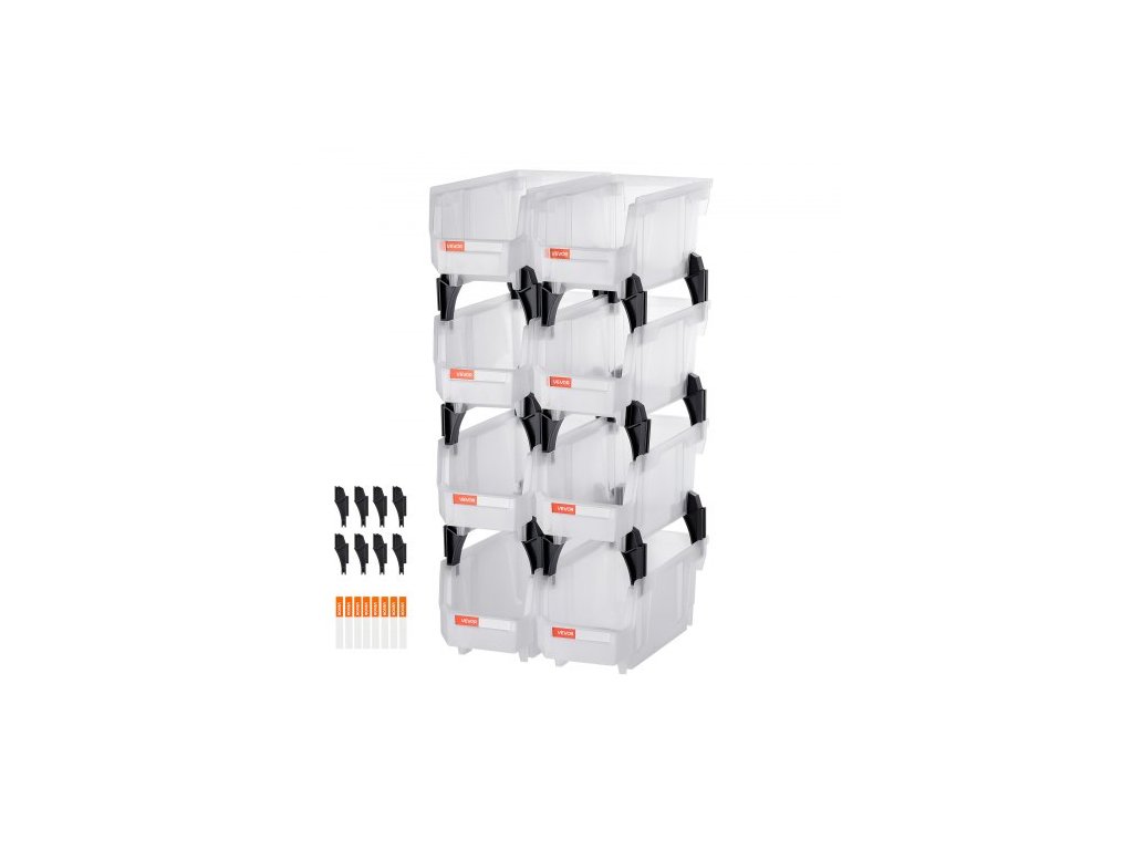 VEVOR Plastové stohovatelné úložné boxy, 27,6 x 14 x 13 cm (balení po 8 kusech), plastové nádoby na organizaci a úložné boxy do skříně, garáže, na drobné díly, kancelářské potřeby a další příslušenství, průhlednéDrážkovaný štítek