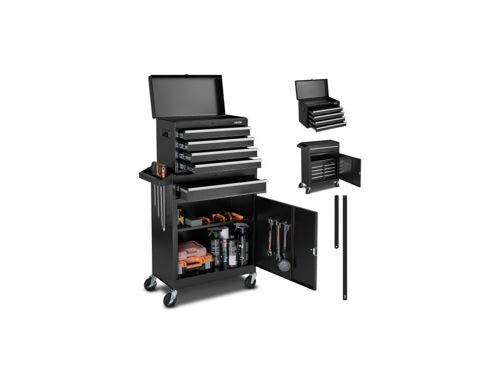 VEVOR Pojízdná skříň na nářadí, design 2 v 1, organizér na nářadí s 5 zásuvkami a odnímatelnou horní kovovou skříňkou na nářadí, zámkem, ochrannou vložkou a stojanem na nářadí, úložná skříň do garáže pro sklad, dílnuMultifunkční truhla na nářadí s kolečky