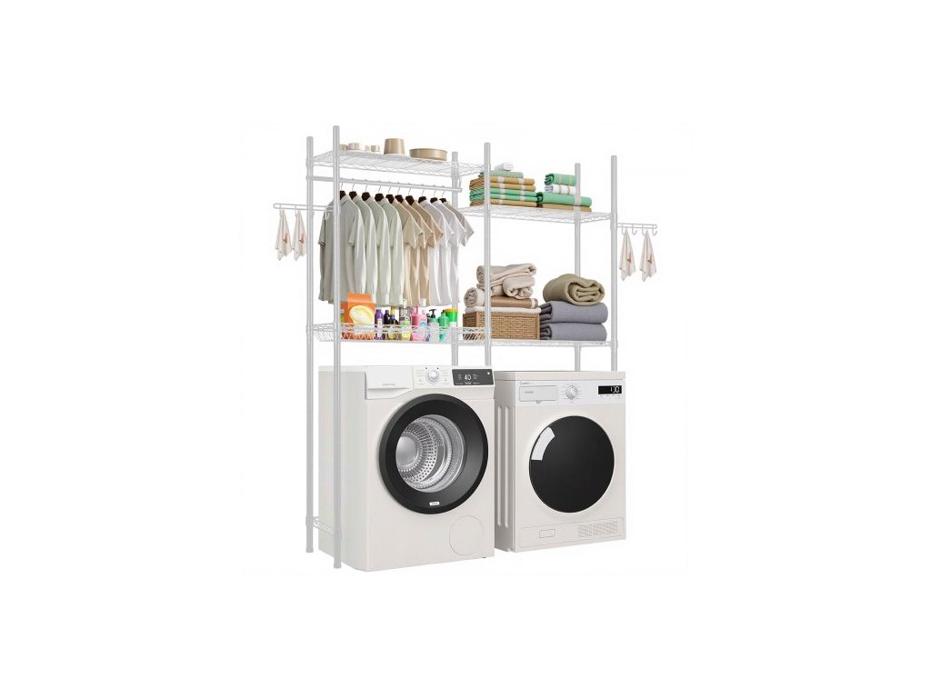 VEVOR Police nad pračku a sušičku, 4 úrovně sušáku do prádelny s tyčí a háčky, dvě řady nastavitelných polic do pračky, šetří místo, pro úložný prostor a organizaci v prádelně, bílé