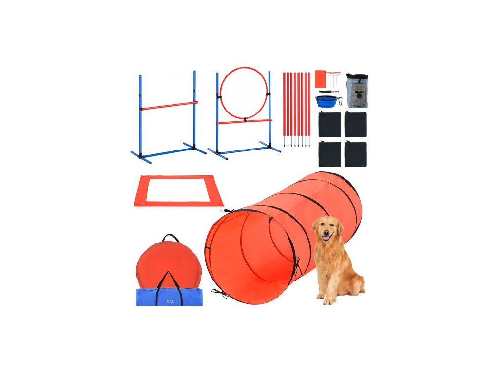 VEVOR Pomůcky pro výcvik psů na agility, 5dílná kombinovaná sada s nastavitelnými vysokými překážkami, 6 tyčemi, tunelem, skákacím kruhem, pauzovacím boxem, píšťalkou, skládací miskou, sadou pro štěňata na překážkovou dráhu se 2 taškami