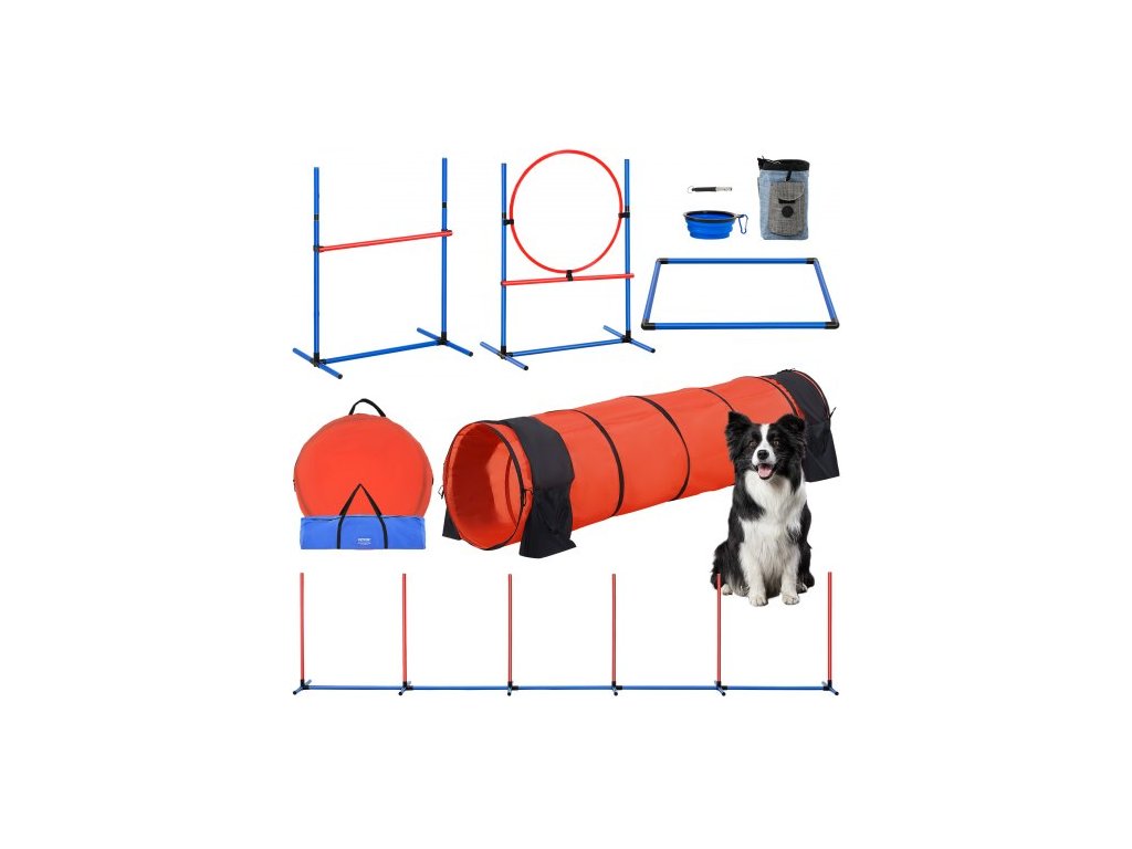 VEVOR Pomůcky pro výcvik psů na agility, sada 5 dílů, vylepšení s nastavitelnými vysokými překážkami, 6 tyčemi, prodlouženým tunelem, skákacím kruhem, pauzovacím boxem, píšťalkou, skládací miskou, sadou pro štěňata s úložným vakem