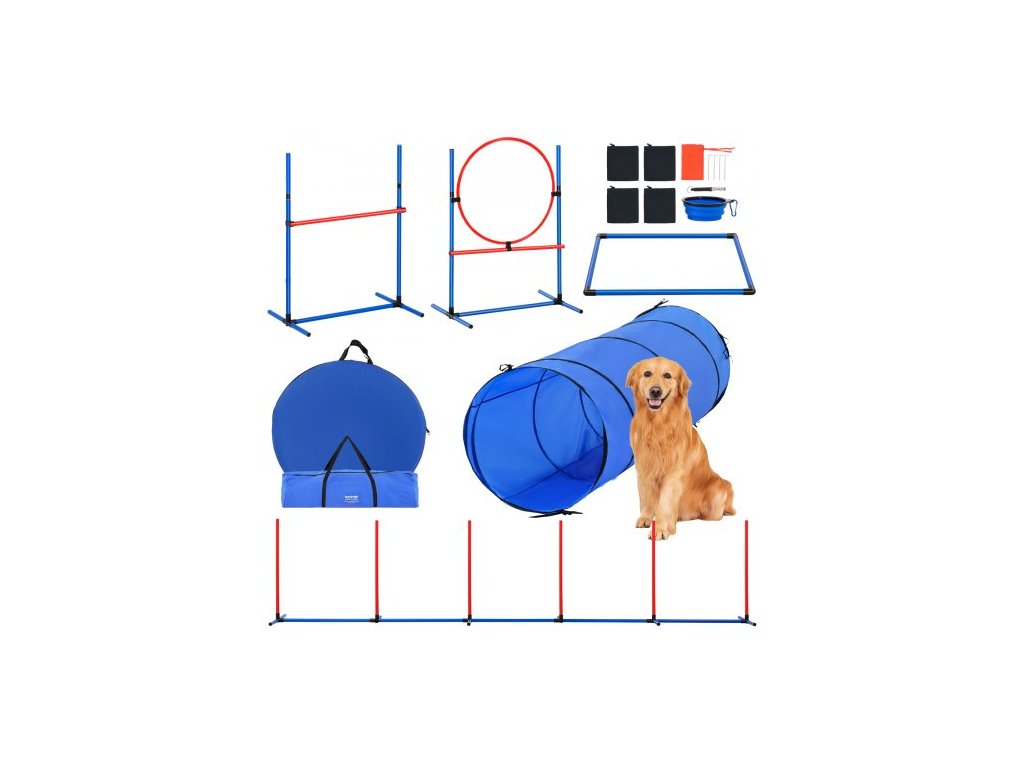 VEVOR Pomůcky pro výcvik psů na agility, sada 5 kusů s nastavitelnými vysokými překážkami, 6 tyčemi, tunelem, skákacím kruhem, pauzovacím boxem, píšťalkou, skládací miskou, sadou překážkové dráhy pro štěňata s úložnými taškami