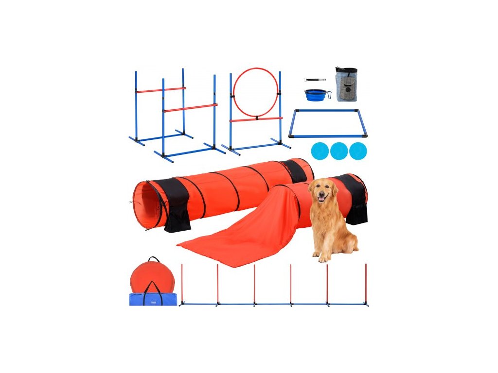 VEVOR Pomůcky pro výcvik psů na agility, sada 7 dílů, vylepšení s nastavitelnými vysokými překážkami, 6 pletenými tyčemi, 2 tunely, skákacím kruhem, pauzovacím boxem, píšťalkou, skládací miskou, sadou pro štěňata s překážkovou dráhou a 3 taškami