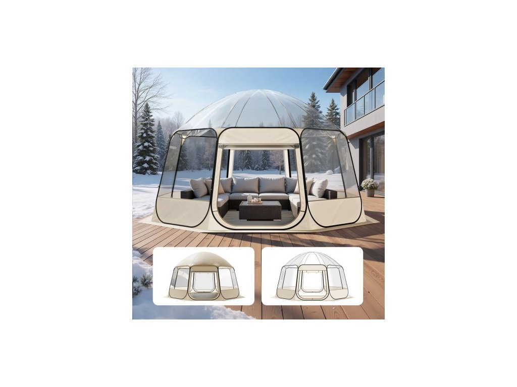 VEVOR Pop-up bublinový stan, 4,58 x 4,32 m, vodotěsný a odolný vůči UV záření, průhledný kempingový přístřešek, venkovní zahradní kopulovitý iglú stan s okny, panoramatický výhled 540°, pro 12–15 osob, terasu, dvůr